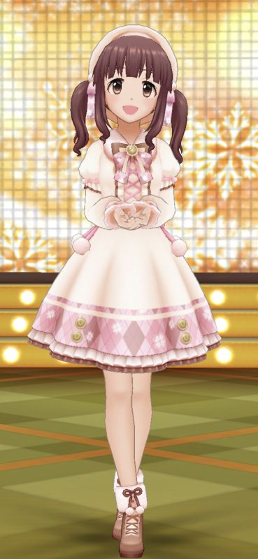 冬の限定SSRということで、ふわっとした衣装になっています。また、帽子を着用しており、普段よりもツインテールの結び目が下になっているところも特徴です。