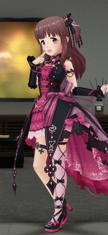 「カラー」で見られるピンクのスパンコールはモバマスのカード[クローバーエンジェル]を元にしていると考えられます。