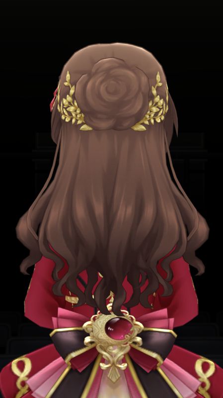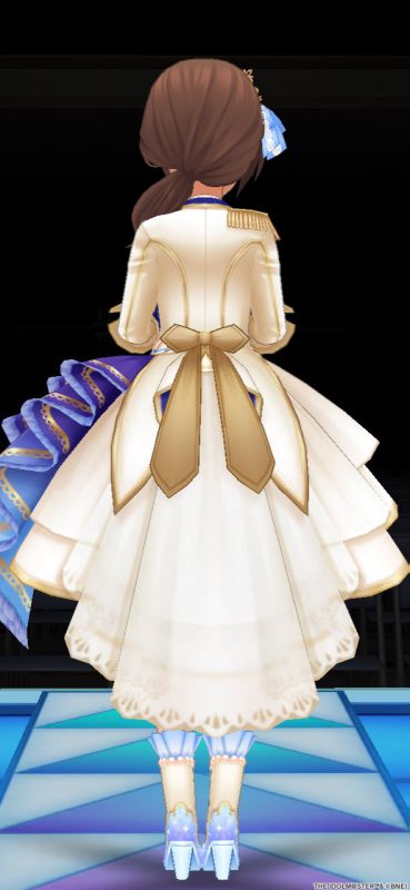 綺麗系のドレス衣装で、青というより個人色のイメージでしょうか。グラデーションカラーのドレスになっており、刺繍の細かさやジュエリー、腰と髪にあしらっている花飾りなども手伝って気品が感じられる衣装になっています。イラストでは隠れてしまっているのですが、花飾りはウェディングブーケに人気のあるバラとカサブランカではないかと思います。そしてパッと見た感じ[アンビバレント・アクト]と同じ髪型のように見えるのですが、実は後れ毛の有無が異なるという細かさ。しっとりとした曲や大人っぽい雰囲気の曲によく合います。